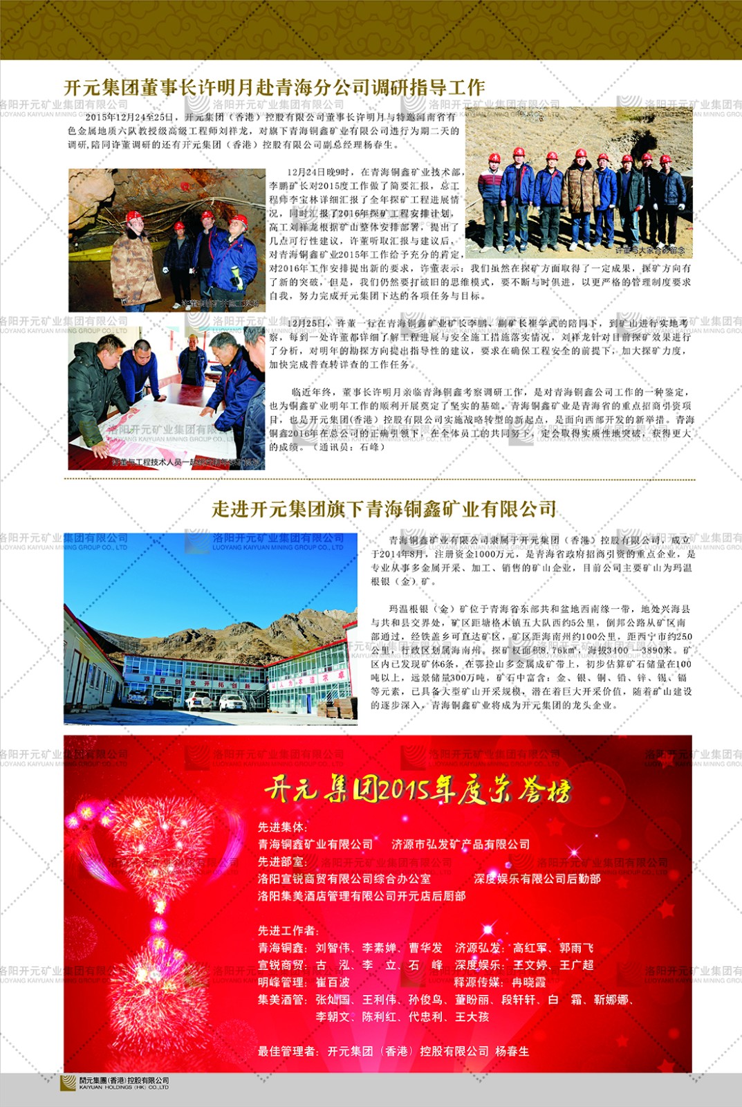 洛陽開元礦業(yè)集團有限公司簡介洛陽開元礦業(yè)集團有限公司,始成立于2006年,位于洛陽市開元大道269號。集團旗下共有五余家全資子公司,業(yè)務涉及有色金屬礦山開發(fā)、礦產品購銷與進出口貿易、房地產開發(fā)、文化藝術、企業(yè)管理與咨詢、資本投資等多個領域。民建河南省委委員、民建河南省委企業(yè)委副主任、民建洛陽市委委員、企業(yè)委主任、洛陽民建企業(yè)家協會會長許明月是公司創(chuàng)始人,現任洛陽開元礦業(yè)集團有限公司董事長。在礦業(yè)領域,洛陽開元礦業(yè)集團擁有多家實力雄厚的子公司:貴州開元礦業(yè)有限公司探、采礦權面積共11.33平方公里;興??h銅鑫礦業(yè)有限公司探礦權面積8.76平方公里,礦山資源潛力巨大;2021年,開元集團與盧氏中科礦業(yè)有限公司開展戰(zhàn)略合作。盧氏中科礦業(yè)有限公司專注于有色金屬的浮選、加工和銷售,擁有強大的技術支撐平臺,是集探、采、選、冶、研為一體的中大型綜合礦業(yè)企業(yè)。目前,盧氏中科王家河1000噸選礦廠已成功投產,雙河金礦、柳關欒盧鉛鋅礦相繼順利開工,樓房銀礦與圪老灣鉛鋅礦的深部探礦重大突破,標志著礦山版圖取得重大進展,為開元集團后續(xù)發(fā)展奠定了堅實基礎。在文化傳媒領域,洛陽市明月美術館通過豐富多樣的藝術展覽、學術研討和公共教育活動,努力打造一個集展覽、交流、教育、研究為一體的綜合性藝術平臺。此外,在金融投資領域,開元集團旗下的北京明峰資本管理有限公司專注于投資具有高增長潛力的優(yōu)秀企業(yè),特別是高科技、新能源、環(huán)保等新興產業(yè),為客戶提供個性化的資產配置服務。在做好企業(yè)經營的同時,開元集團始終不忘企業(yè)的社會責任和家國情懷,以突出的愛心公益事跡,開展了一系列公益慈善活動:“民建林”公益事業(yè)通過“思源基金”“幫幫公益”線上公益平臺,與眾多愛心人士籌措資金20余萬元;資助541名貧困大學生共計270余萬元,推進“數字助力——河南AI人才培養(yǎng)”;捐款10萬元,馳援京津冀、黑龍江洪水地質災害……公司于2017年底被洛陽市慈善總會評為“洛陽慈善風云榜——十大愛心集體”。洛陽開元礦業(yè)集團有限公司秉承持續(xù)發(fā)展理念,憑借多年來良好的企業(yè)信譽與經營業(yè)績,與全國多家企業(yè)建立了良好合作關系,受到社會各界的一致好評,多次榮獲“納稅標兵”“先進企業(yè)”“招商引資模范企業(yè)”等榮譽稱號。回望來時路,開元人勠力同心,以“闖”的精神和“創(chuàng)”的勁頭,一路披荊斬棘,踏過千山萬水;展望新未來,開元人凝心聚力,不執(zhí)于“舊”,無畏于“新”,秉承“勇于跨越,追求卓越”的企業(yè)精神,乘著國家高質量發(fā)展新征程的東風,跨過高山,越過大海,向著集團多元化、國際化的目標,逐夢遠航,跨越前行!