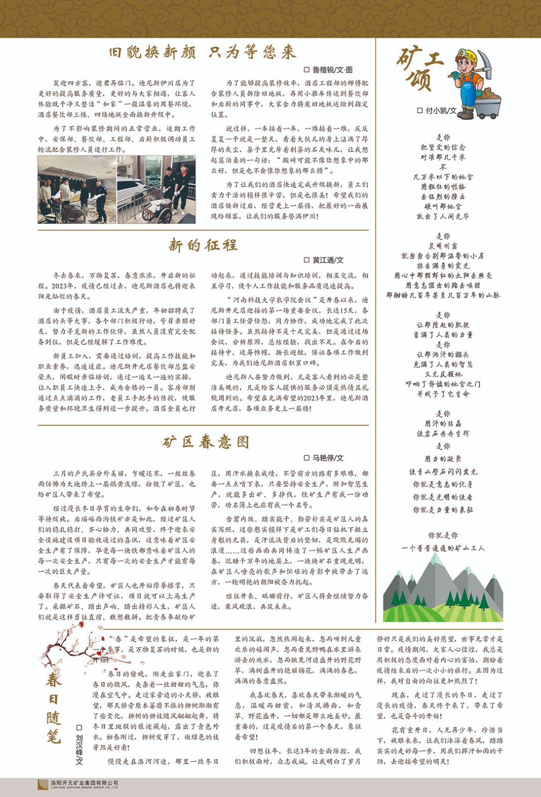 洛陽開元礦業(yè)集團有限公司簡介洛陽開元礦業(yè)集團有限公司,始成立于2006年,位于洛陽市開元大道269號。集團旗下共有十余家全資子公司,業(yè)務涉及有色金屬礦山開發(fā)、礦產品購銷與進出口貿易、房地產開發(fā)、文化藝術、企業(yè)管理與咨詢、資本投資等多個領域。2024年,集團公司銷售總額達7.8億元。民建河南省委委員、民建河南省委企業(yè)委副主任、民建洛陽市委委員、企業(yè)委主任、洛陽民建企業(yè)家協(xié)會會長許明月是公司創(chuàng)始人,現任洛陽開元礦業(yè)集團有限公司董事長。在礦業(yè)領域,洛陽開元礦業(yè)集團擁有多家實力雄厚的子公司:貴州開元礦業(yè)有限公司探、采礦權面積共11.33平方公里;興??h銅鑫礦業(yè)有限公司探礦權面積8.76平方公里,礦山資源潛力巨大;2021年,開元集團與盧氏中科礦業(yè)有限公司開展戰(zhàn)略合作。盧氏中科礦業(yè)有限公司專注于有色金屬的浮選、加工和銷售,擁有強大的技術支撐平臺,是集探、采、選、冶、研為一體的中大型綜合礦業(yè)企業(yè)。目前,盧氏中科王家河1000噸選礦廠已成功投產,雙河金礦、柳關欒盧鉛鋅礦相繼順利開工,樓房銀礦與圪老灣鉛鋅礦的深部探礦重大突破,標志著礦山版圖取得重大進展,為開元集團后續(xù)發(fā)展奠定了堅實基礎。在文化傳媒領域,洛陽市明月美術館通過豐富多樣的藝術展覽、學術研討和公共教育活動,努力打造一個集展覽、交流、教育、研究為一體的綜合性藝術平臺。此外,在金融投資領域,開元集團旗下的北京明峰資本管理有限公司專注于投資具有高增長潛力的優(yōu)秀企業(yè),特別是高科技、新能源、環(huán)保等新興產業(yè),為客戶提供個性化的資產配置服務。在做好企業(yè)經營的同時,開元集團始終不忘企業(yè)的社會責任和家國情懷,以突出的愛心公益事跡,開展了一系列公益慈善活動:“民建林”公益事業(yè)通過“思源基金”“幫幫公益”線上公益平臺,與眾多愛心人士籌措資金20余萬元;資助541名貧困大學生共計270余萬元,推進“數字助力——河南AI人才培養(yǎng)”;捐款10萬元,馳援京津冀、黑龍江洪水地質災害……公司于2017年底被洛陽市慈善總會評為“洛陽慈善風云榜——十大愛心集體”。洛陽開元礦業(yè)集團有限公司秉承持續(xù)發(fā)展理念,憑借多年來良好的企業(yè)信譽與經營業(yè)績,與全國多家企業(yè)建立了良好合作關系,受到社會各界的一致好評,多次榮獲“納稅標兵”“先進企業(yè)”“招商引資模范企業(yè)”等榮譽稱號?;赝麃頃r路,開元人勠力同心,以“闖”的精神和“創(chuàng)”的勁頭,一路披荊斬棘,踏過千山萬水;展望新未來,開元人凝心聚力,不執(zhí)于“舊”,無畏于“新”,秉承“勇于跨越,追求卓越”的企業(yè)精神,乘著國家高質量發(fā)展新征程的東風,跨過高山,越過大海,向著集團多元化、國際化的目標,逐夢遠航,跨越前行!