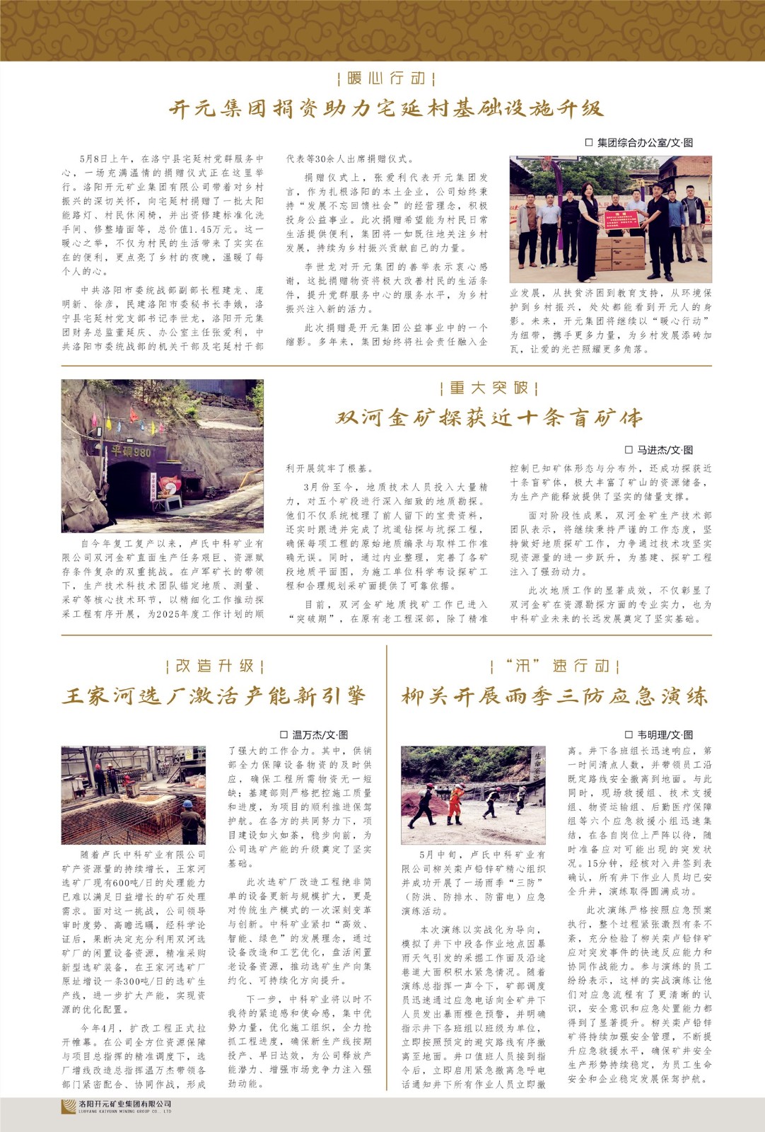 洛陽(yáng)開(kāi)元礦業(yè)集團(tuán)有限公司簡(jiǎn)介洛陽(yáng)開(kāi)元礦業(yè)集團(tuán)有限公司,始成立于2006年,位于洛陽(yáng)市開(kāi)元大道269號(hào)。集團(tuán)旗下共有十余家全資子公司,業(yè)務(wù)涉及有色金屬礦山開(kāi)發(fā)、礦產(chǎn)品購(gòu)銷與進(jìn)出口貿(mào)易、房地產(chǎn)開(kāi)發(fā)、文化藝術(shù)、企業(yè)管理與咨詢、資本投資等多個(gè)領(lǐng)域。2024年,集團(tuán)公司銷售總額達(dá)7.8億元。民建河南省委委員、民建河南省委企業(yè)委副主任、民建洛陽(yáng)市委委員、企業(yè)委主任、洛陽(yáng)民建企業(yè)家協(xié)會(huì)會(huì)長(zhǎng)許明月是公司創(chuàng)始人,現(xiàn)任洛陽(yáng)開(kāi)元礦業(yè)集團(tuán)有限公司董事長(zhǎng)。在礦業(yè)領(lǐng)域,洛陽(yáng)開(kāi)元礦業(yè)集團(tuán)擁有多家實(shí)力雄厚的子公司:貴州開(kāi)元礦業(yè)有限公司探、采礦權(quán)面積共11.33平方公里;興??h銅鑫礦業(yè)有限公司探礦權(quán)面積8.76平方公里,礦山資源潛力巨大;2021年,開(kāi)元集團(tuán)與盧氏中科礦業(yè)有限公司開(kāi)展戰(zhàn)略合作。盧氏中科礦業(yè)有限公司專注于有色金屬的浮選、加工和銷售,擁有強(qiáng)大的技術(shù)支撐平臺(tái),是集探、采、選、冶、研為一體的中大型綜合礦業(yè)企業(yè)。目前,盧氏中科王家河1000噸選礦廠已成功投產(chǎn),雙河金礦、柳關(guān)欒盧鉛鋅礦相繼順利開(kāi)工,樓房銀礦與圪老灣鉛鋅礦的深部探礦重大突破,標(biāo)志著礦山版圖取得重大進(jìn)展,為開(kāi)元集團(tuán)后續(xù)發(fā)展奠定了堅(jiān)實(shí)基礎(chǔ)。在文化傳媒領(lǐng)域,洛陽(yáng)市明月美術(shù)館通過(guò)豐富多樣的藝術(shù)展覽、學(xué)術(shù)研討和公共教育活動(dòng),努力打造一個(gè)集展覽、交流、教育、研究為一體的綜合性藝術(shù)平臺(tái)。此外,在金融投資領(lǐng)域,開(kāi)元集團(tuán)旗下的北京明峰資本管理有限公司專注于投資具有高增長(zhǎng)潛力的優(yōu)秀企業(yè),特別是高科技、新能源、環(huán)保等新興產(chǎn)業(yè),為客戶提供個(gè)性化的資產(chǎn)配置服務(wù)。在做好企業(yè)經(jīng)營(yíng)的同時(shí),開(kāi)元集團(tuán)始終不忘企業(yè)的社會(huì)責(zé)任和家國(guó)情懷,以突出的愛(ài)心公益事跡,開(kāi)展了一系列公益慈善活動(dòng):“民建林”公益事業(yè)通過(guò)“思源基金”“幫幫公益”線上公益平臺(tái),與眾多愛(ài)心人士籌措資金20余萬(wàn)元;資助541名貧困大學(xué)生共計(jì)270余萬(wàn)元,推進(jìn)“數(shù)字助力——河南AI人才培養(yǎng)”;捐款10萬(wàn)元,馳援京津冀、黑龍江洪水地質(zhì)災(zāi)害……公司于2017年底被洛陽(yáng)市慈善總會(huì)評(píng)為“洛陽(yáng)慈善風(fēng)云榜——十大愛(ài)心集體”。洛陽(yáng)開(kāi)元礦業(yè)集團(tuán)有限公司秉承持續(xù)發(fā)展理念,憑借多年來(lái)良好的企業(yè)信譽(yù)與經(jīng)營(yíng)業(yè)績(jī),與全國(guó)多家企業(yè)建立了良好合作關(guān)系,受到社會(huì)各界的一致好評(píng),多次榮獲“納稅標(biāo)兵”“先進(jìn)企業(yè)”“招商引資模范企業(yè)”等榮譽(yù)稱號(hào)。回望來(lái)時(shí)路,開(kāi)元人勠力同心,以“闖”的精神和“創(chuàng)”的勁頭,一路披荊斬棘,踏過(guò)千山萬(wàn)水;展望新未來(lái),開(kāi)元人凝心聚力,不執(zhí)于“舊”,無(wú)畏于“新”,秉承“勇于跨越,追求卓越”的企業(yè)精神,乘著國(guó)家高質(zhì)量發(fā)展新征程的東風(fēng),跨過(guò)高山,越過(guò)大海,向著集團(tuán)多元化、國(guó)際化的目標(biāo),逐夢(mèng)遠(yuǎn)航,跨越前行!